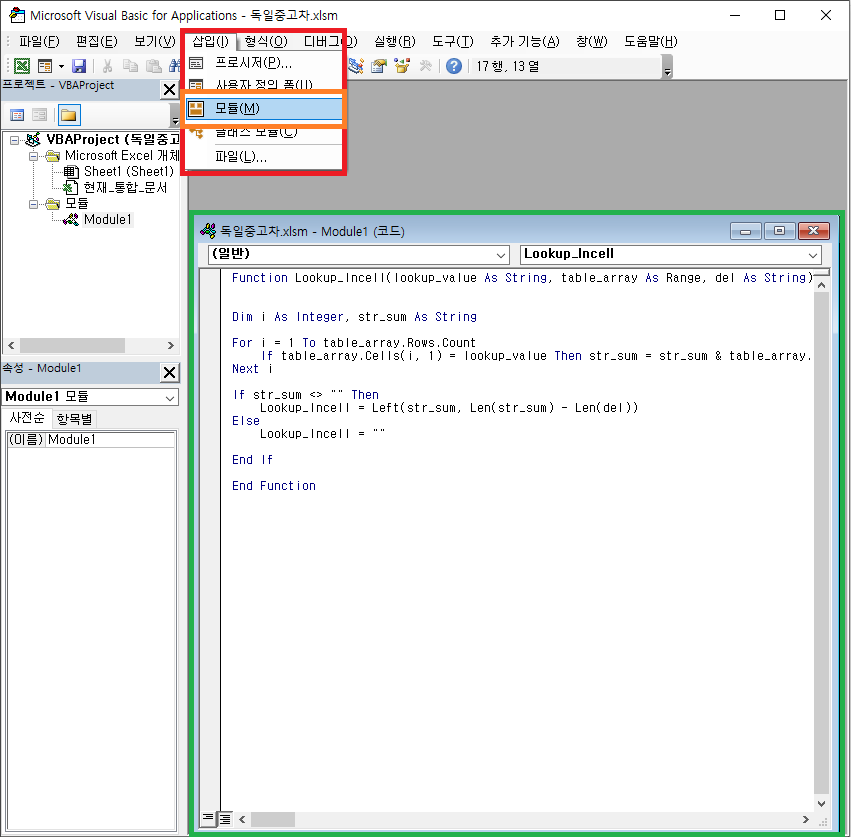 메뉴에서 [삽입] -> [모듈(M)] 을 차례로 선택 [Module(코드)] 입력창을 엽니다.