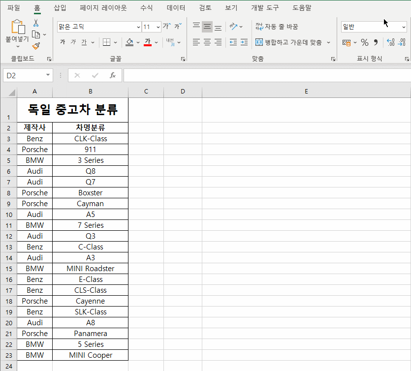 이후 끌어서 채워 넣기를 하면 나머지 Porsche, BMW, Audi 의 세부 중고차 명이 채워집니다.