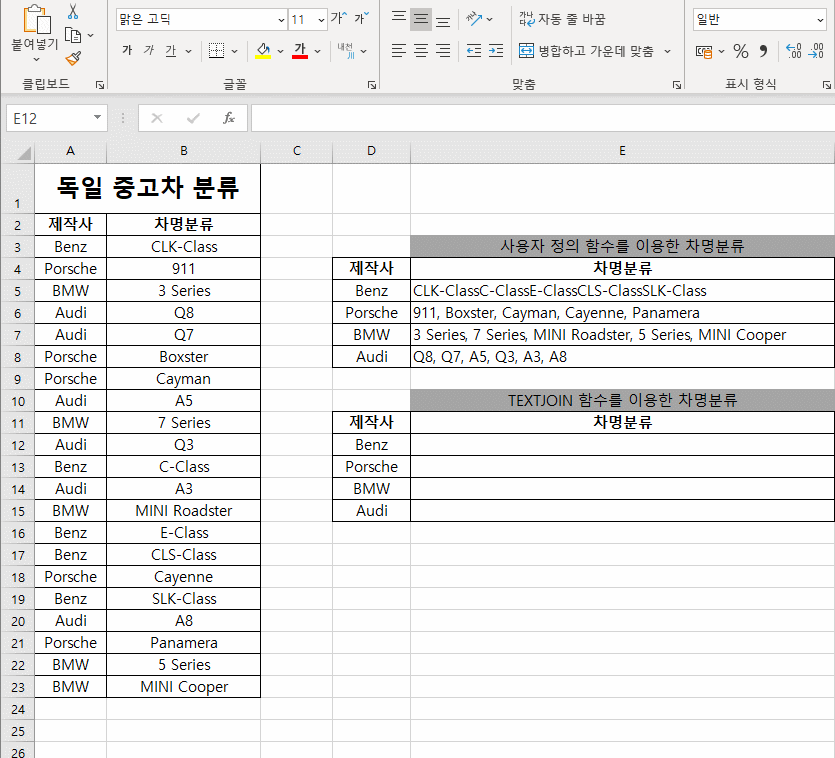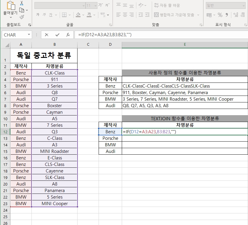 TEXTJOIN 함수를 이용한 차명분류표의 제작사 D12 와