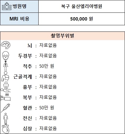북구 울산엘리야병원의 MRI 가격은 척추, 혈관 자료만 있으며 두 부위 모두 500,000원 입니다.